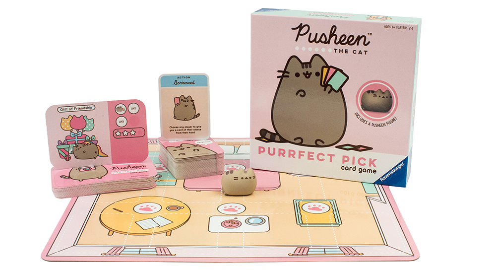 Pusheen Purrfect Pick asks players to collect cards to help Pusheen (the popular cartoon cat) and her friends create fun memories by going on trips, eating some yummy snacks, and more. The goal of each game is to be the first player to earn 10 stars by collecting special “Snapshot Cards.” In order to collect a Snapshot Card, players will first need to collect “Essentials” Cards from the game board, which feature items like cupcakes, rainbows, and even some of Pusheen’s animal friends.