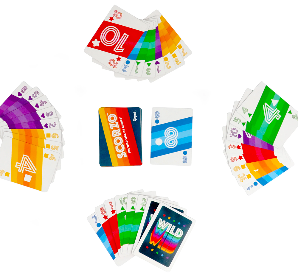 Scorzo is a card game inspired by the classic game of Rummy. It challenges players to get rid of the cards in their hands by forming sets and runs with those cards. In this case, a “set” is a group of three or more cards with the same number, while a “run” is a group of three or more cards of the same suit with numbers going in order (for instance, “1, 2, 3” of hearts or “7, 8, 9” of triangles). Rather than laying a set or run on the table as soon as it’s created, players will need to keep all of their cards in their hand until every card they have can be used in a set or a run. At that point, they’ll call out “Scorzo!,” and the other players will have one more turn to try and create sets and runs in their own hands.