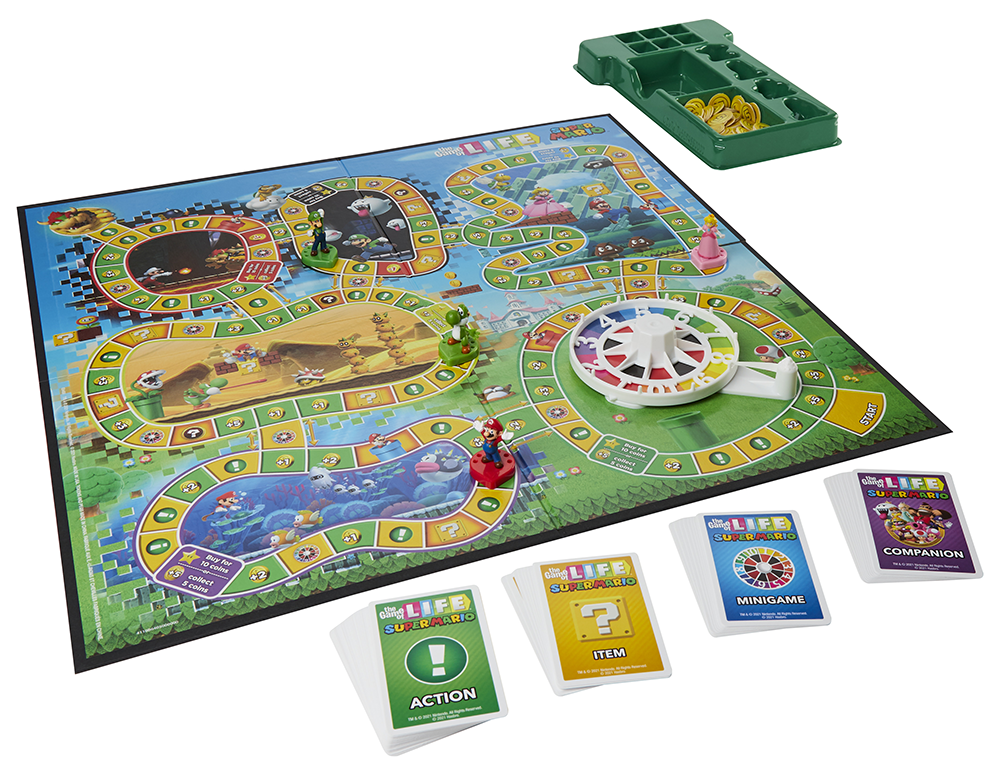 In the classic version of The Game of Life, players work their way through their character’s life, making career, family, and other life choices until they eventually reach retirement. In The Game of Life: Super Mario Edition, players will explore the Mushroom Kingdom and choose from different paths as they work to defeat Bowser. Along the way, they can play mini-games (such as Rock, Paper, Scissors) and collect items and companions that are featured on cards. They can also collect stars in order to battle Bowser.