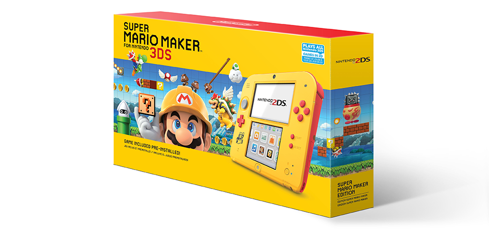 This bundle will be available beginning Black Friday and while supplies last. It includes a yellow and red 2DS console with Super Mario Maker pre-installed. Super Mario Maker lets players design their own “Super Mario”-style side-scrolling platforming levels using different elements from throughout the franchise’s history (blocks, enemies, bonuses, etc.). Users can also play levels created by other users. Nintendo 2DS plays most Nintendo 3DS games, but doesn’t support 3D graphics. The Nintendo 2DS also can’t play any games that are exclusive to the “New Nintendo 3DS” line of handhelds.